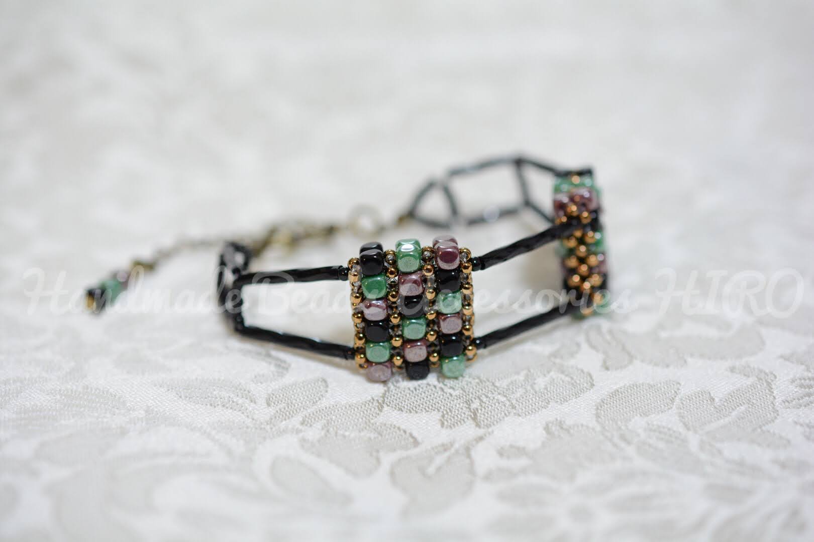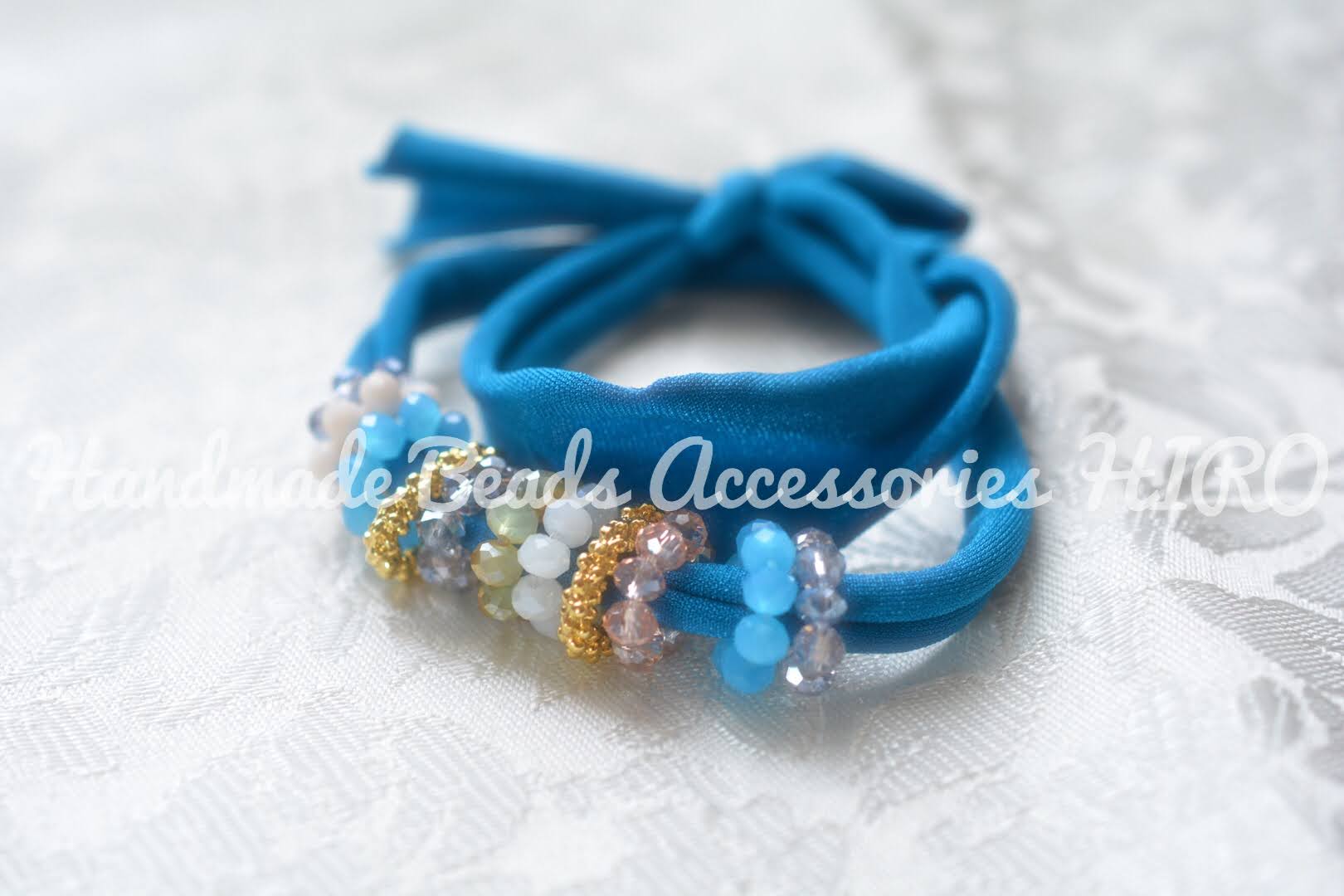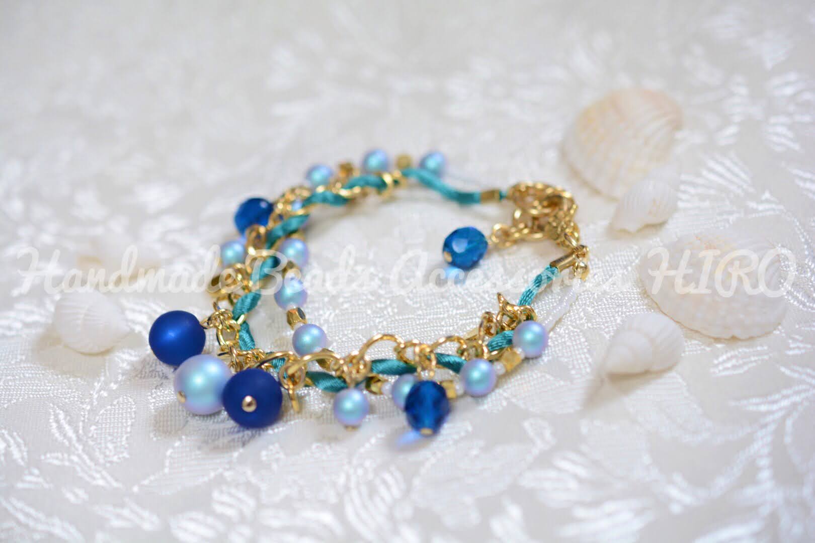 キューブ状のビーズをスクエアに編んだパーツを2個作り、チェコシードビューグルやバンブービーズで繋げてブレスレットにしました。 スワロフスキーパールやアクリルビーズ、サテンコード、チェーンを合わせて、様々なブルーの色味が美しく輝くブレスレットにしました。スワロフスキーパールの『イラデサントライトブルー』という色味、本当に綺麗で大好きです。 ヨーロピアンストレッチリボンに様々な色のガラスビーズで作った輪っかを通して、夏らしいブレスレットにしました。ストレッチリボンは着脱しやすいですね。