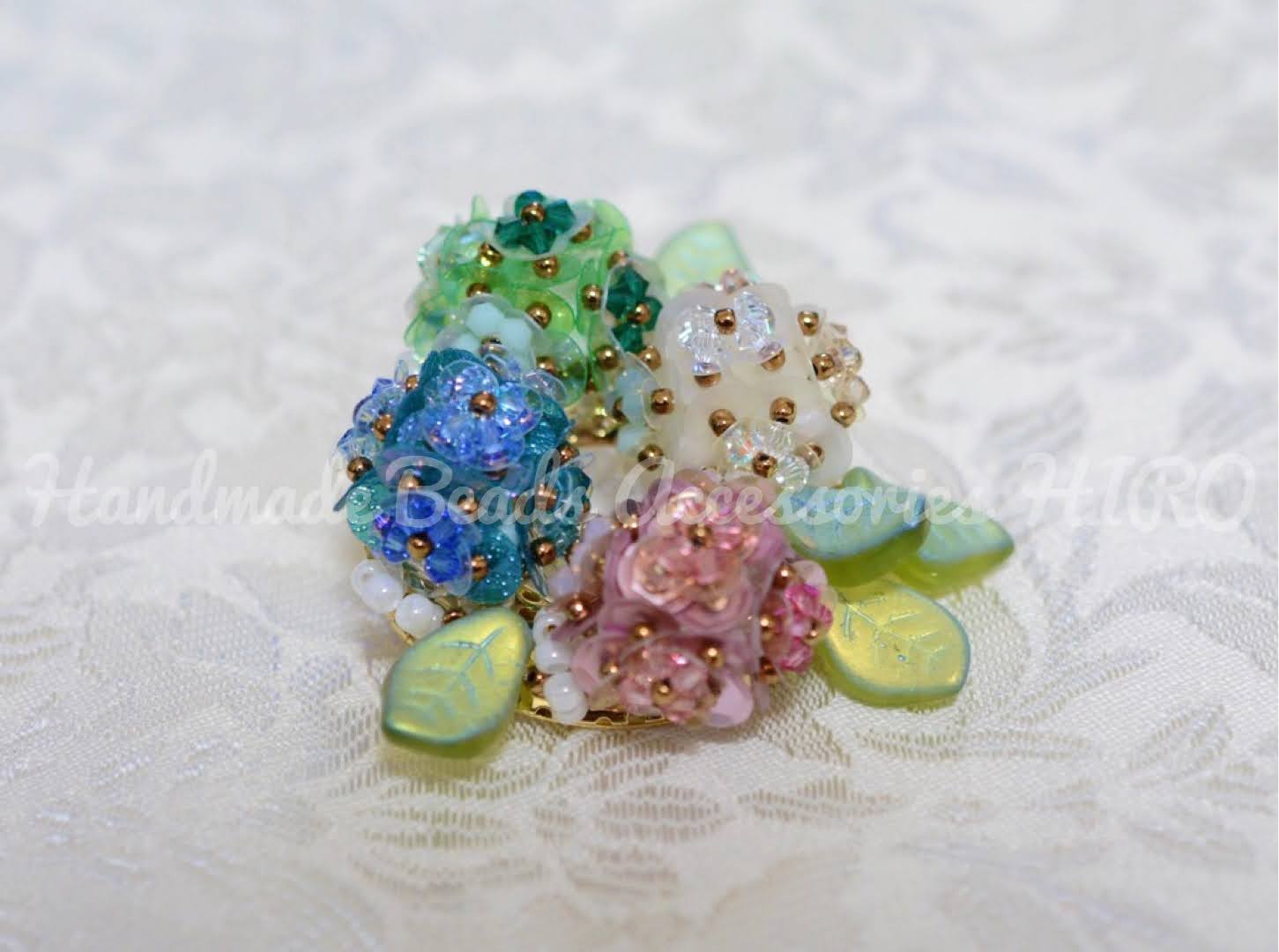 すべて色が違うスパンコールと細かく色を変えたスワロフスキーが、雨に濡れた紫陽花の雰囲気を演出したリースブローチです。